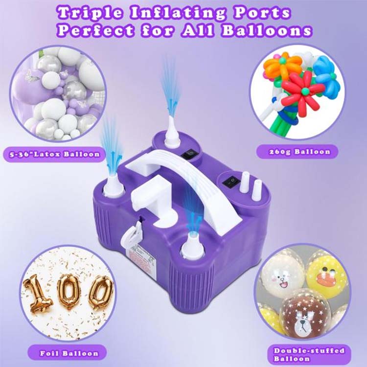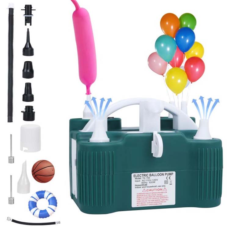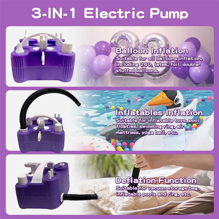 Електрическата балонна помпа е оборудвана с 5 професионални дюзи за инфлация, маркуч за удължаване, игла с двойна топка и маркуч за инфлация на топката, които лесно могат да се справят с голямо оборудване като надуваеми матраци, плувни пръстени, йога топки, надуваеми лодки и могат точно да надуят спортните топки като баскетболи, футболи и волейболи. Специално включени са специална резачка за балон и интелигентен възел, така че да може да се извърши рязане и завой на балони в една стъпка. Дори новаците могат бързо да завършат оформяне на балони от професионален ниво.