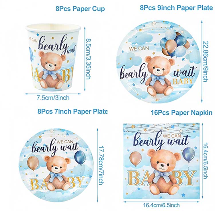 Размер на комплекта чинии за еднократна употреба за рожден ден на бебе: Продуктът е опакован в торби OPP, но се предлага и опаковка от хартиени картички. Можем да персонализираме опаковката според специфичните изисквания на клиента.