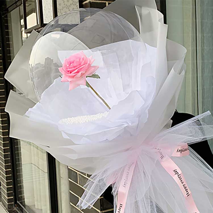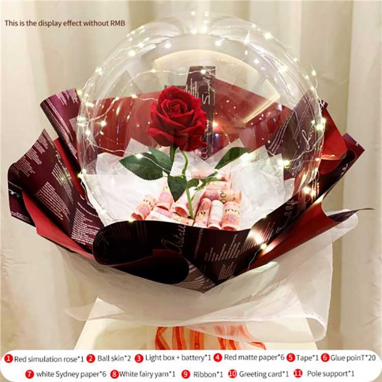 размер:Версията от висок клас с дължина около 50 см с пръчка с дължина 35 см; средната и стандартната версия използва пръчка с дължина 70 cm с общ размер около 80 cm. Версията от висок клас включва повечеаксесоари:3 слоя тишу хартия 3 слоя флорална опаковъчна хартия 1 слой марля. версията от среден клас включва: 1 слой тишу хартия 1 слой опаковъчна хартия 1 слой марля. Стандартната версиявключва:1 слой марлени балони BOBO във формата на сърце.