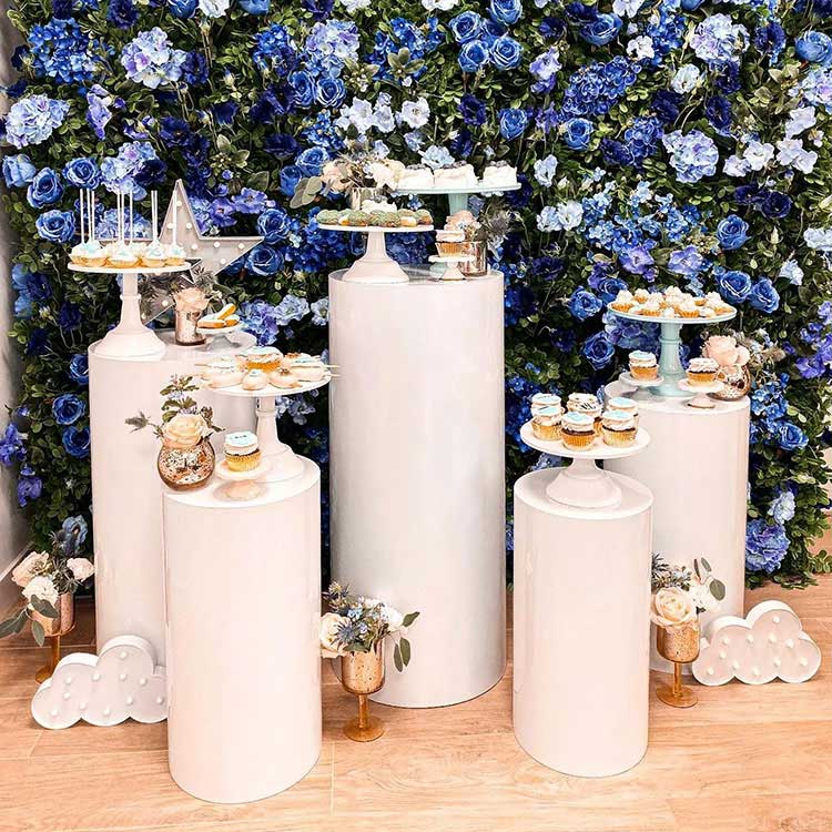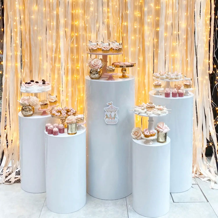 Десертната маса с цилиндрична основа служи както за контейнер, така и за украшение. Обикновено те се предлагат в различни комбинации: комбинации от 3 части, комбинации от 5 части, комбинации от 7 части и т.н. Най-често срещаната комбинация е пет части. Независими цилиндрични тръби с различни размери могат да бъдат гъвкаво подредени и те са важна част от сцената. В същото време предлагаме и персонализиране за размер и форма. Нещо повече, те подхождат на вашата парти украса.