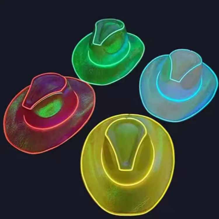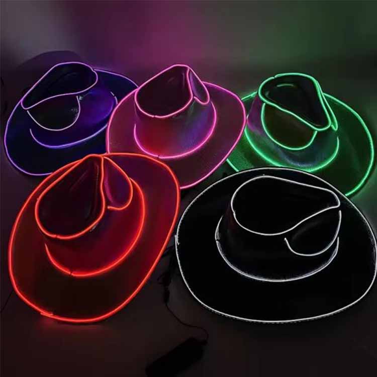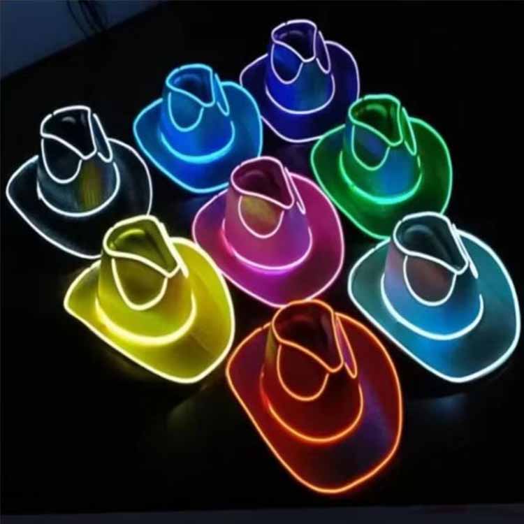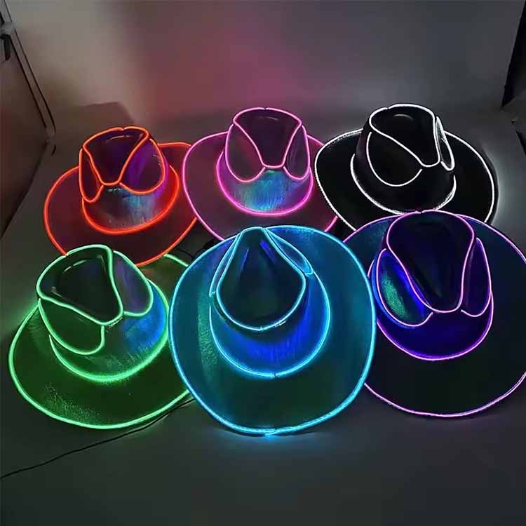 Тази светодиодна флуоресцентна цветна шапка е лесна за използване и може лесно да се монтира само за 5 минути. Просто поставете две AA батерии, включете превключвателя и се насладете на забавлението на светещата каубойска шапка.