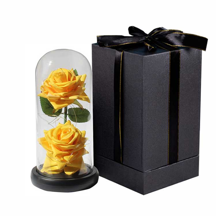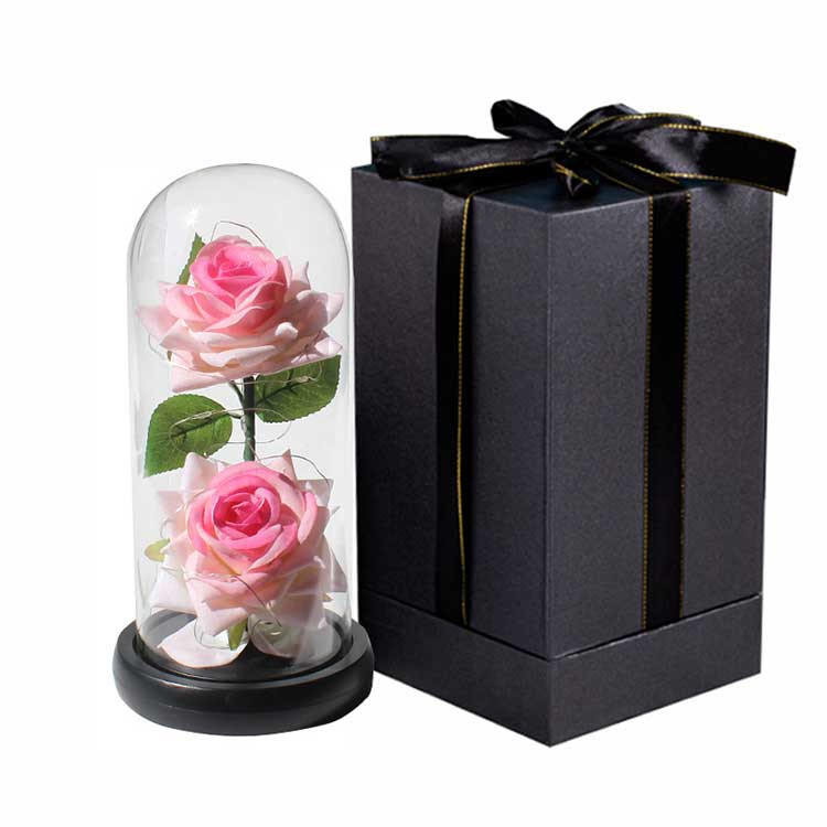 Ние предлагаме PVC и кадифени листенца, а интериорът може да бъде персонализиран с различни малки фигурки, за да се подобри привлекателността на продукта. За разлика от свежите цветя, които изискват поливане и подрязване, това не изисква поддръжка. Просто избърсвайте стъкления купол от време на време с мека кърпа, за да го поддържате чист и нов, идеално подходящ за днешния забързан начин на живот.